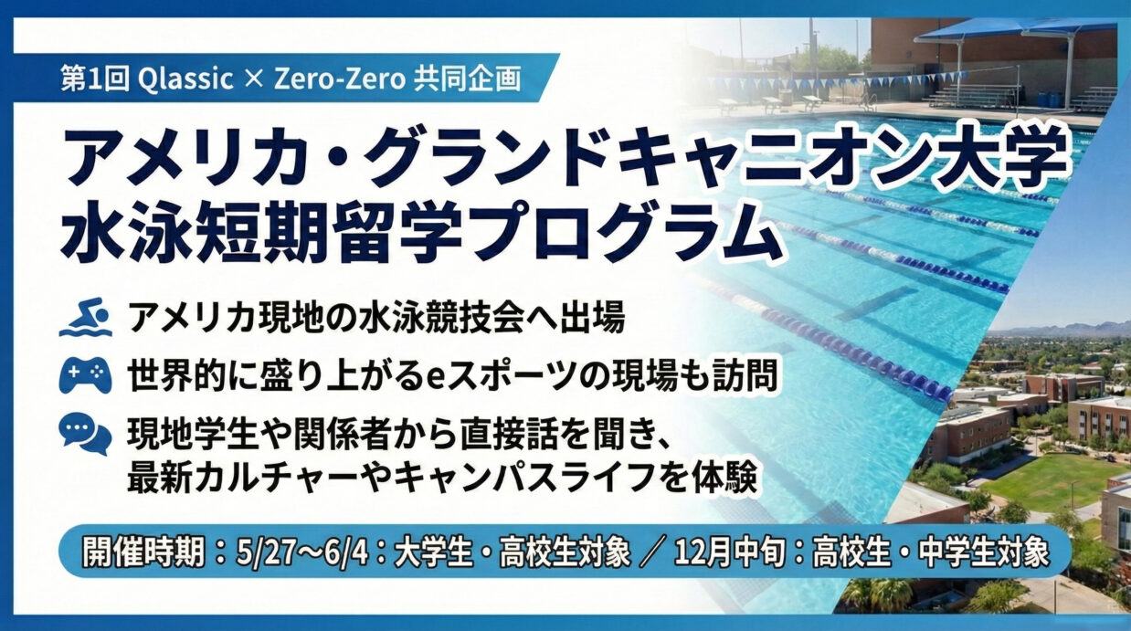 株式会社Qlassicでは、アメリカ大学スポーツ留学の専門機関であるZero-Zero株式会社と共同で実施する「アメリカ・グランドキャニオン大学 水泳短期留学プログラム」に関するオンライン説明会を開催いたします。本プログ…